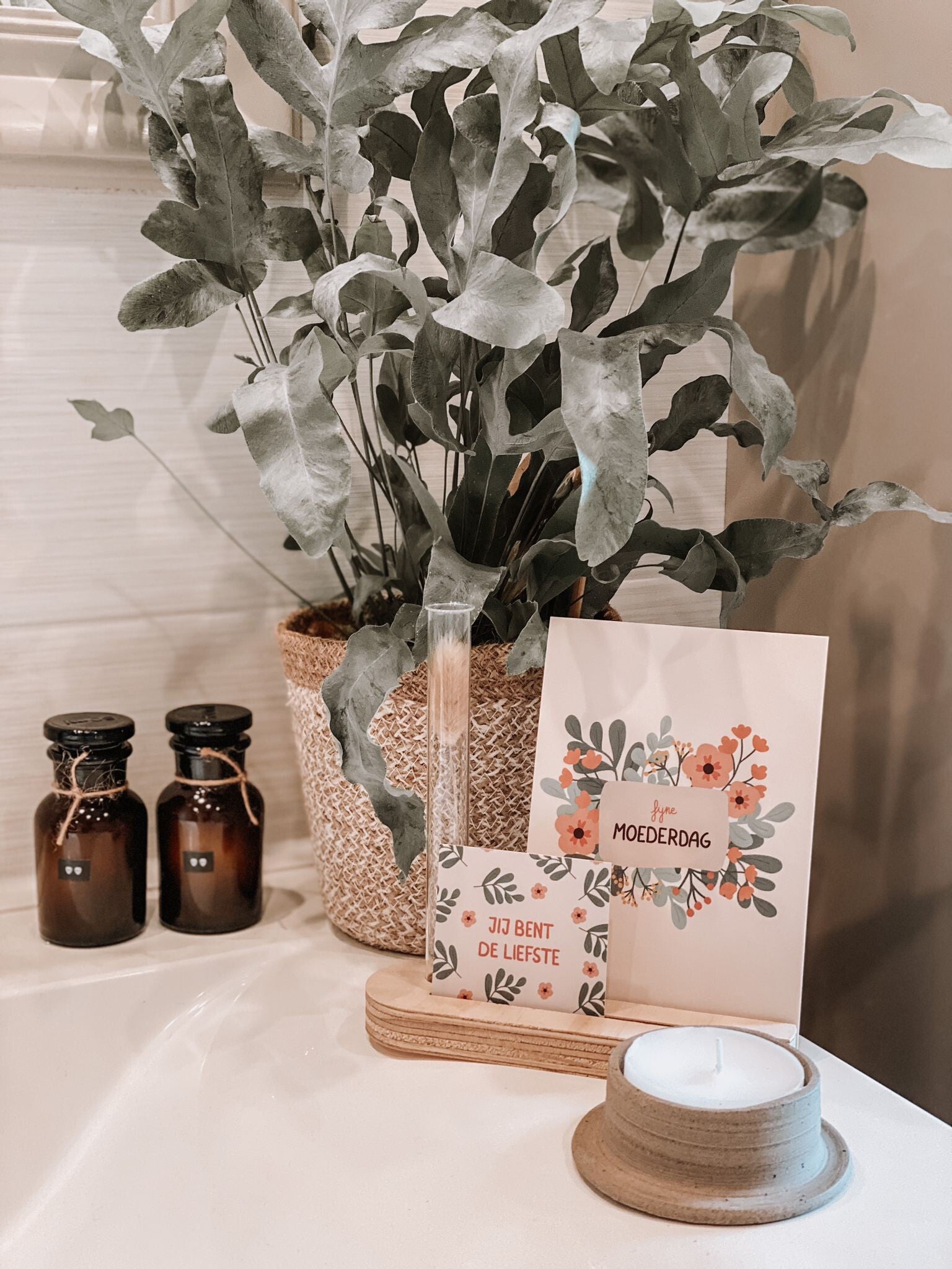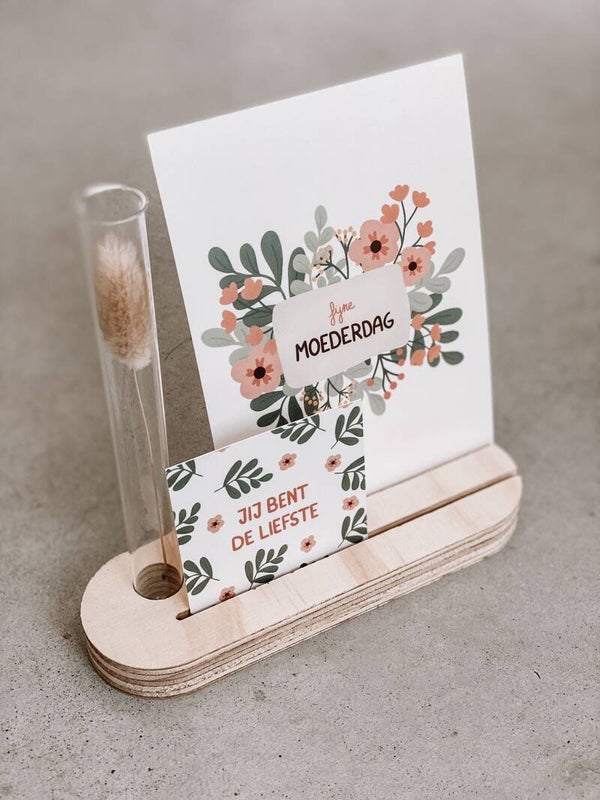 - Kaarthouder met twee bijpassende kaartjes en vaasje met droogbloemetje. Na Moederdag kan je één van de kaartjes vervangen door een leuke foto.